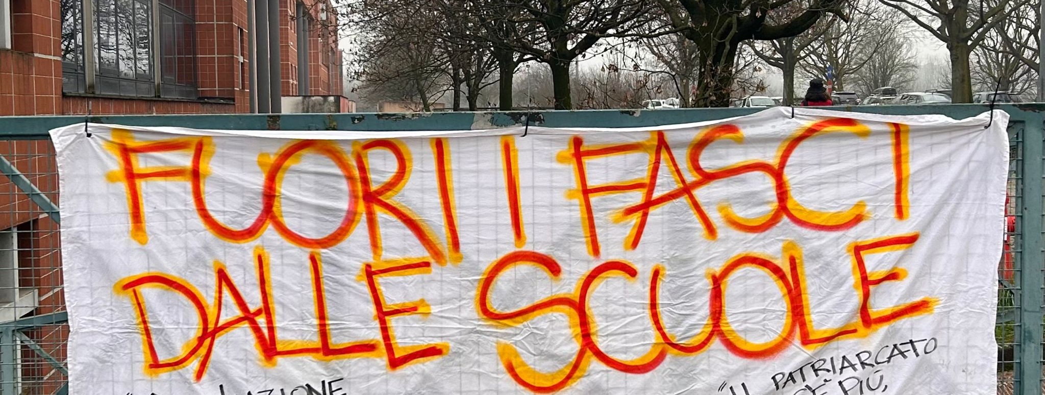 Un simile atteggiamento sarebbe stato mostrato nei confronti dei volantini stampati dagli studenti, sui quali erano riportate dichiarazioni rilasciate pubblicamente da Valditara in occasioni passate. Questi sarebbero stati rimossi poco prima dell’evento dalla «polizia e alcuni docenti». Stessa sorte è toccata allo striscione affisso all’esterno. Su questo, campeggiava la scritta “Fuori i fasci dalle scuole”, con sotto le stesse citazioni del Ministro. Gli studenti hanno in seguito eliminato le citazioni volendo evitare «un’associazione implicita fra il fascismo e Valditara». Questo non è però bastato a evitare la rimozione dello striscione. «Non sappiamo chi sia stato» commentano i ragazzi, ignorando se l’iniziativa arrivi dalla scuola o dalle forza di polizia presenti in numero massiccio per l’evento, con il compito di sorvegliare l’intero edificio e non solo gli spazi oggetto della visita.