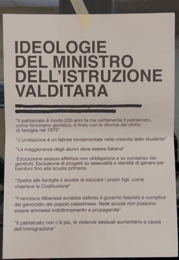 In occasione dell’incontro con il Ministro, nella parte iniziale della conferenza sarebbe stato vietato di fare riprese video dagli agenti di polizia. Questo mentre il Ministro, venuto in possesso dei volantini,avrebbe negato le affermazioni riportate. Tuttavia, dichiarazioni come l’umiliazione è «un fattore fondamentale nella crescita» o «la maggioranza degli alunni deve essere italiana» risultano facilmente riconducibili a Valditara e alla sua visione di scuola, essendo state rilasciate pubblicamente e risultando facilmente documentabili. Solo in seguito sarebbe stato permesso di registrare video della conferenza, al momento di rispondere alle domande.
